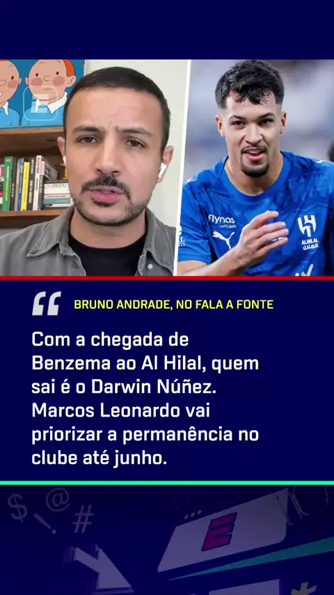 Efeito Benzema no Al Hilal! 🇫🇷🔥 Com a chegada de Benzema, Darwin Núñez foi o escolhido para deixar o clube e Marcos Leonardo prioriza ficar até junho. Bruno Andrade conta os detalhes! Saiba TUDO do mercado da bola no Fala a Fonte!