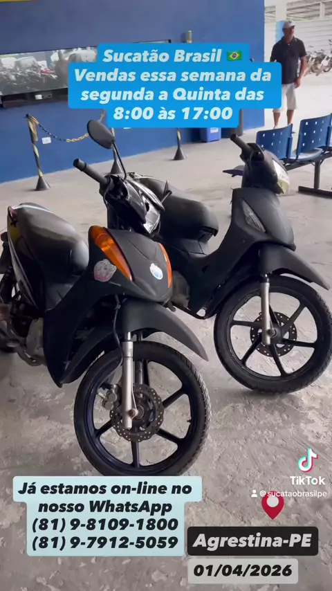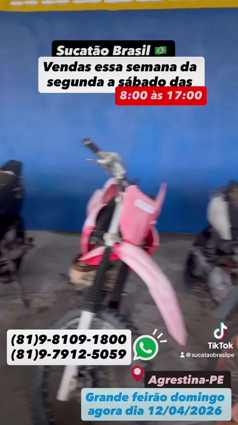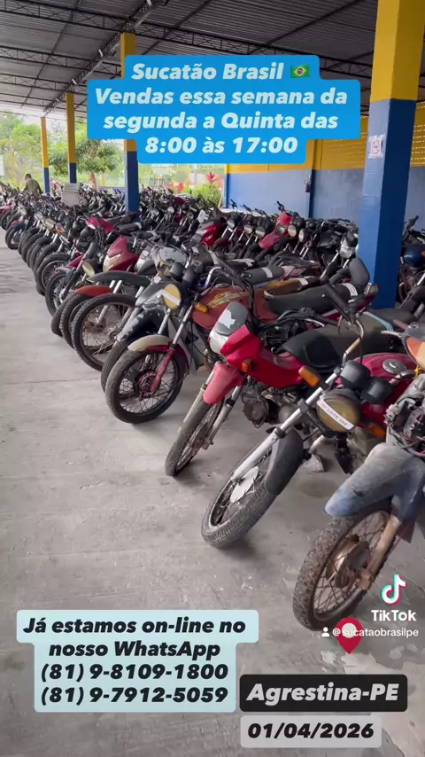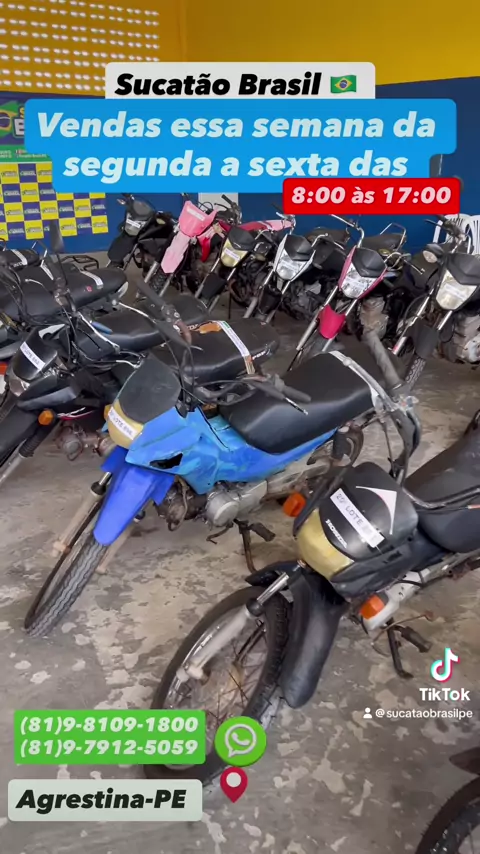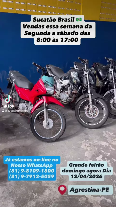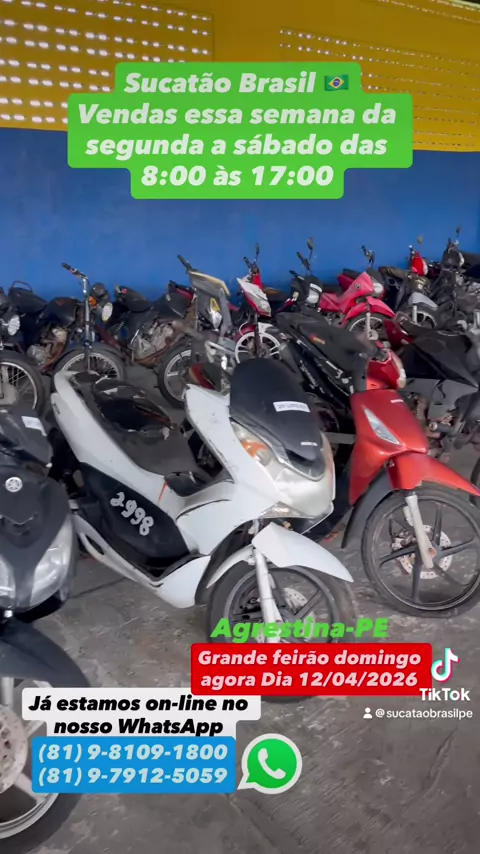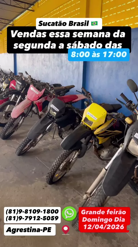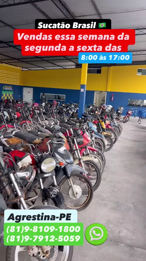 Motos Sucatas,Zap 81 98109-1800,Todas Preços Fixos,Promoção De 50% De Descontos,Apartir De 200,00 Reais,Vendas Seg A Sáb De 8 As 5 Da Tarde,Domingo 8:00 a 12:00,PE-120 Agrestina,Sai Com Notas De Leilão Nome Do Comprador,Aceita Pix,Cartões,Transferência