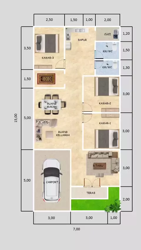 Denah Rumah ukuran 7x15m : 3 K. Tidur, 2 K. Mandi. Semoga bermanfaat. Bikin denah rumah biaya mulai 50.000 per lantai (bukan per meter). Link order ada di bio. #desainrumahminimalis #rumahminimalis #denahrumah #jasadesainrumah