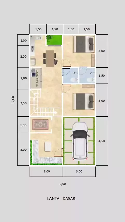 Denah Rumah ukuran 6x12m : 2 K. Tidur, 2 K. Mandi. Semoga bermanfaat. Bikin denah rumah biaya mulai 50.000 per lantai (bukan per meter). Link order ada di bio. #desainrumahminimalis #rumahminimalis #denahrumah #jasadesainrumah