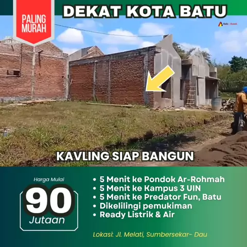 Tanah Kavling Dekat Kota Batu Lokasi : Jl. Melati, Sumbersekar, Dau (Perumahan Buana Residence) Harga mulai 90 jutaan. Selling Point: • Kavling siap bangun • Dikelilingi pemukiman warga • Jaringan Listrik dan Air sudah tersedia • 5 Menit ke Predator Fun Park Batu • 5 Menit ke Pondok Ar-Rohmah • 5 Menit ke Kampus 3 UIN Kedokteran • 10 Menit ke kampus UMM 3 Info selengkapnya: 085804049606 Video lokasi : https://.com/post/UgkxtEuP3EPQ_HMJPHX7_Fn37m0OAeXHAVaZ?si=IcmNOMb6OOicl3kl #jualtana...
