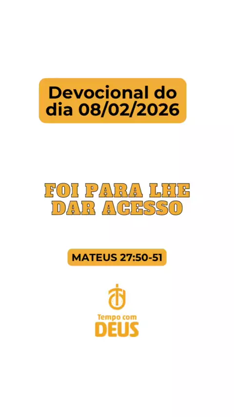 Devocional do dia 08/02/2026 FOI PARA LHE DAR ACESSO Mateus 27:50-51 “Depois de ter bradado novamente em alta voz, Jesus entregou o espírito. Naquele momento, o véu do santuário rasgou-se em duas partes, de alto a baixo. A terra tremeu, e as rochas se partiram” “Deus pode tirar a divisão e trazer a unidade” Curte, comente e compartilhe 🙌🙌🙌🔥🔥🔥🙌🙌🙌 #devocional #tempocomdeus #deus #jesus #acesso