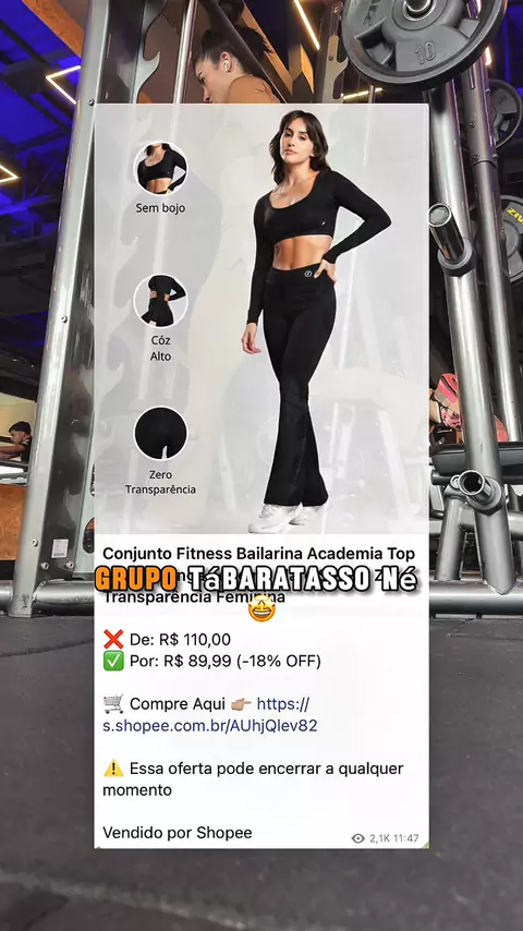 Look novo, autoestima lá em cima e o precinho? Só no Tábaratasso mesmo! 💥 Zero transparência, cor linda e caimento perfeito. #LookDeTreino #modafitness Siga @tabaratasso postamos diariamente as melhores ofertas das melhores lojas e acompanhe as melhores promoções online 🤗