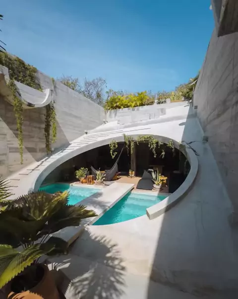 Bangunan ini diirancang oleh arsitek ternama asal Prancis, @LudwigGodefroy, dalam gaya Brutalis yang berani, @CasaHezbo menawarkan pengalaman hidup yang unik antara ruang dalam dan luar, dengan taman-taman rimbun dan kolam renang pribadi yang menyatu dengan area hunian. Tata letaknya mencakup dua kamar tidur dan dua kamar mandi lengkap. Kamar utama menempati lantai atas, sementara kamar kedua terletak di lantai utama, berdampingan dengan area komunal terbuka. Salah satu ciri khas bangunan ini a...