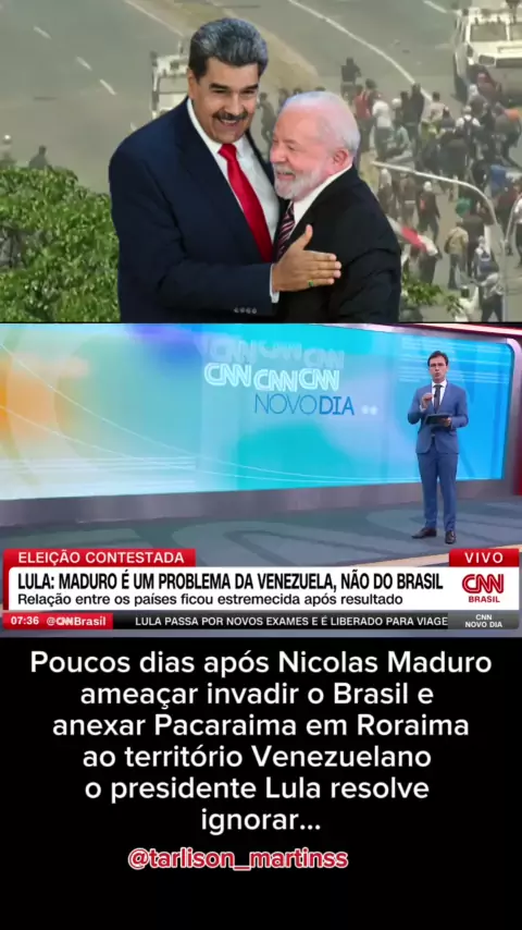 Maduro aumenta a tensão na fronteira ao reivindicar Pacaraima como território venezuelano. Forças Armadas brasileiras monitoram a situação. Em uma escalada de provocações, Nicolás Maduro, presidente da Venezuela, declarou pretensões sobre a cidade de Pacaraima, em Roraima, alegando abandono e presença venezuelana majoritária. A Polícia Nacional da Venezuela publicou nas redes sociais uma imagem editada do presidente brasileiro Luiz Inácio Lula da Silva com a frase "Quem se mete com a Venezuela