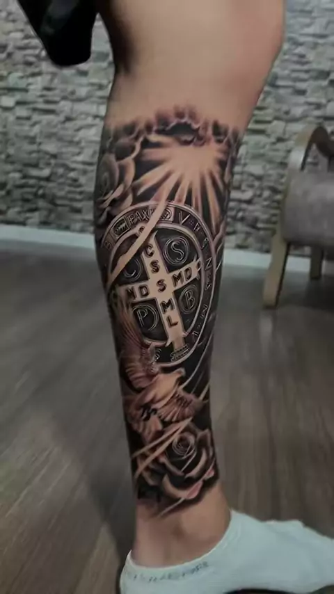 #tattovibe5 #tattooideas #tattooartist #tattoo #tatuagens #tattoolover #tattoos #tattoo #medalhadesaobento #acruzsagradasejaminhaluz #luz #amor #escudo #poder #oracao