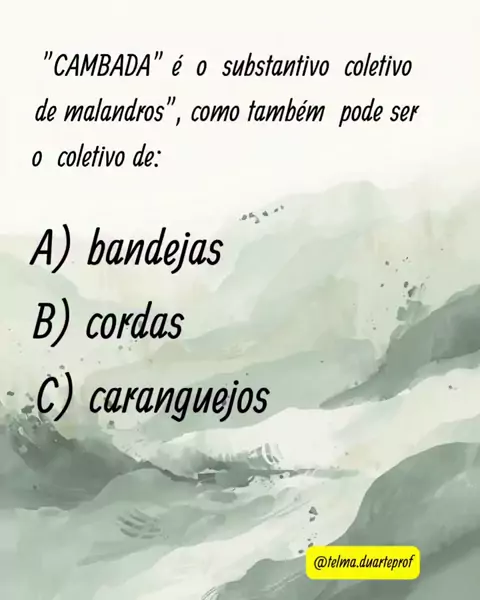 Substantivo coletivo #professores #dicas #linguaportuguesa #português #gramatica #substantivo • • • ✔️Curta! ✔️Salva! ✔️Comenta! 📌Siga:@telma.duarteprof 😉🌞🇧🇷📢🙌❤️🫶 Resposta: o coletivo de cabras é "FATO". O coletivo de malandros é corja, malta, cambada, o coletivo de camelos é cáfila, o coletivo de selos é álbum ou acervo.