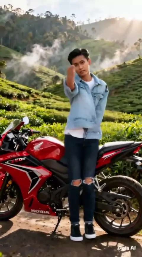 "Kenangan indah." "Foto realistis, potret setengah badan seorang pria muda berkulit putih mulus bersih, duduk di kafe outdoor, tersenyum ke arah kamera, mengenakan kemeja kasual atau jaket. Dia duduk di kursi menghadap pemandangan perkebunan teh hijau yang luas di bukit-bukit, dengan jalan berkelok yang ramai dengan lalu lintas di kejauhan. Langit saat sore hari berwarna cerah dengan sedikit kabut di pegunungan, suasananya sejuk dan damai. Di atas meja kaca ada minuman dan camilan. Pen...