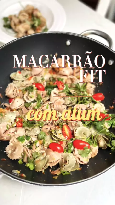 Macarrão FIT com Atum . Ingredientes . 150g macarrão integral do tipo Tortellini 1 lata de atum ao natural 1 colher de sopa de cebola picada 1 colher de sopa de alho picado 1 colher de sopa de pimentão vermelho picado 1 colher de sopa de pimentão amarelo picado 1 pimentinha de cheiro 4 tomates cereja Coentro à gosto Cebolinha à gosto Sal rosa à gosto Pimenta preta à gosto Gergelim à gosto Azeite #receita #fit #macarao #dieta #thalitayanomany