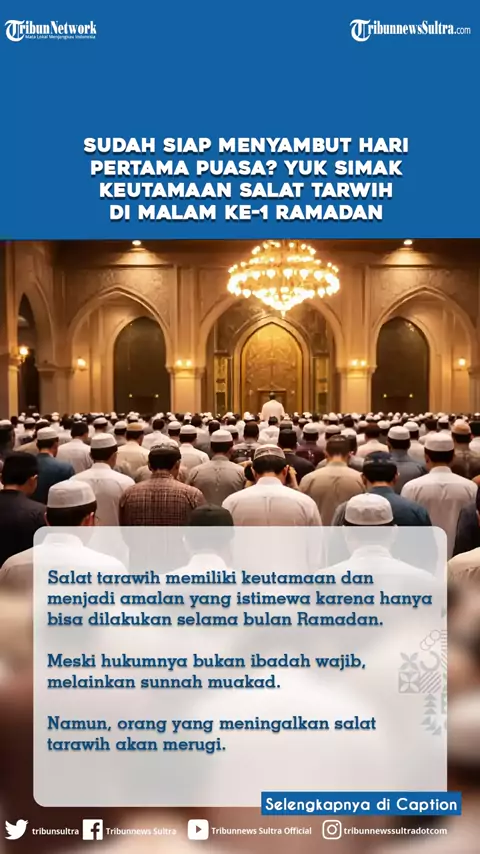 TRIBUNNEWSSULTRA.COM, KENDARI - Simak keutamaan Salat Tarawih, lengkap bacaan niat dalam bahasan arab, latin dan terjemahan. Awal Ramadan 1447 Hijriah akan ditetapkan pemerintah melalui Kementerian Agama dalam sidang isbat Selasa, 17 Februari 2026, besok. Sidang isbat akan digelar di Auditorium HM Rasjidi, Kantor Kemenag, Thamrin Jakarta Pusat. Setelah pemantauan hilal di 96 titik lokasi yang tersebar di seluruh Indonesia Salah satunya ada di wilayah Provinsi Sulawesi Tenggara (Sultra). Tepatn...