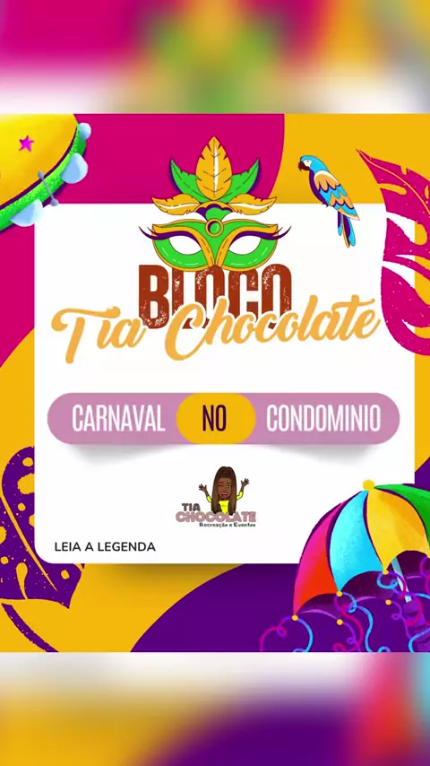 🎭🎉 Bloco da Tia Chocolate – Carnaval no seu condomínio! 🎉🎭 A folia vem até você! 🎶✨ Que tal trazer toda a alegria do Carnaval para o seu condomínio com a equipe da Tia Chocolate? Muita música, brincadeiras, confete e diversão garantida para a criançada e toda a família! 🥳🎊 📍 Nós levamos a animação até você! 📅 Agende agora e faça seu orçamento. 📩 Chama no direct e garanta seu Carnaval cheio de cor e alegria! 💜💛💙 #CarnavalComATiaChocolate #BlocoInfantil #CarnavalNoCondomínio