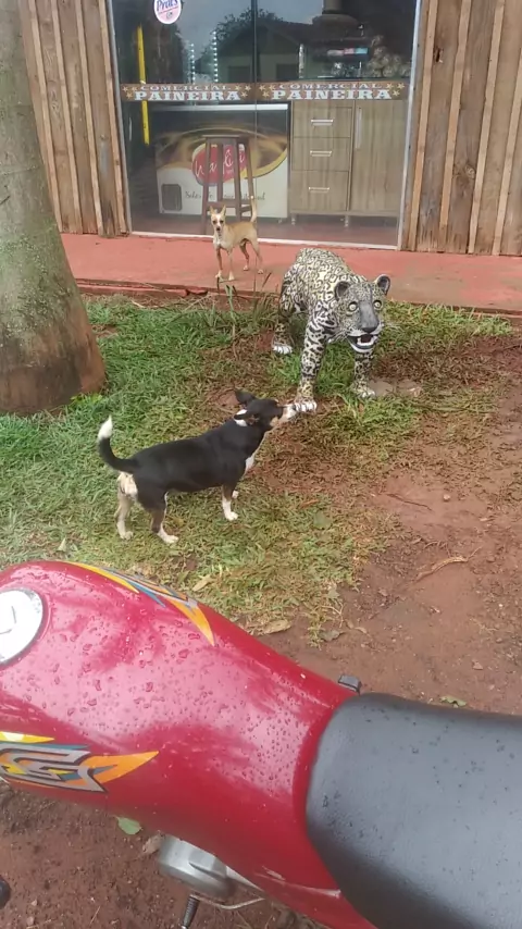 O cachorro estava cismado com a onça de cimento