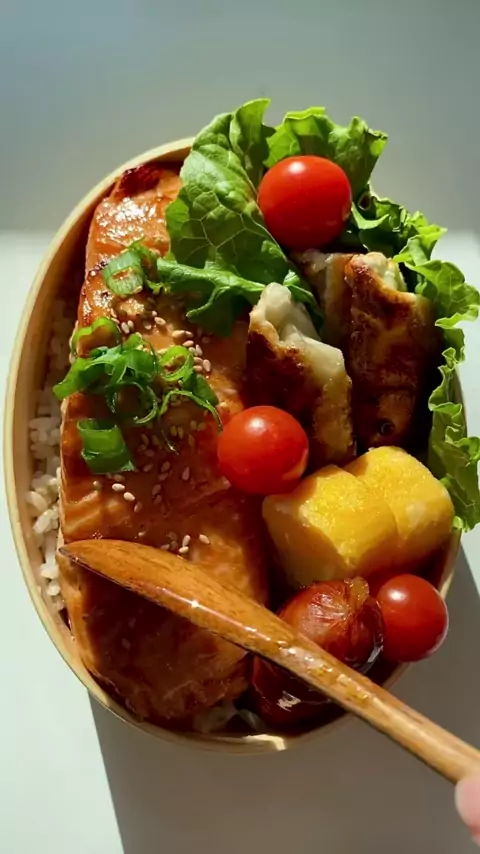 Teriyaki Salmon Bento in the air fryer 🧡#teriyakisalmon#teriyaki#bento#bentobox#homemadefood#japanesefood#easyrecipes