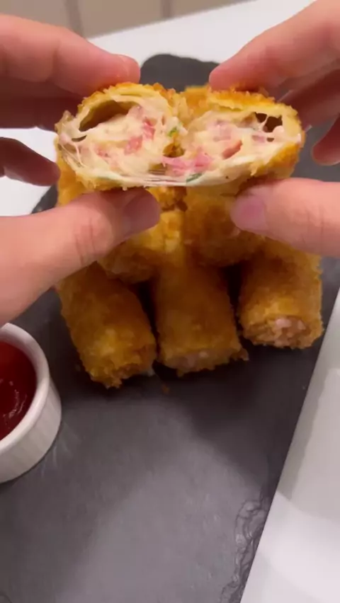 Receita de quinta 😋 Enroladinho de queijo com linguiça Blumenau 😋 Receita: Massa de lasanha pré-cozida 1 linguiça Blumenau 200g de queijo mussarela 1 requeijão Salsinha Sal e pimenta a gosto Farinha de trigo, farinha panko e ovos batidos para empanar Óleo para fritar Rende 14 enroladinhos