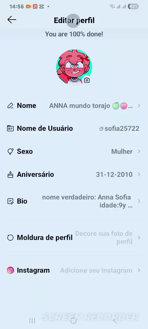 apelido: xayane idd:9y signo: virgem cor favorita:azul vermelho vicio:mundo torajo personagem preferido :morajo AniversΓ‘rio:21/9/2016 melhor amiga:@star edts oc:Bianca nova meta : 3000