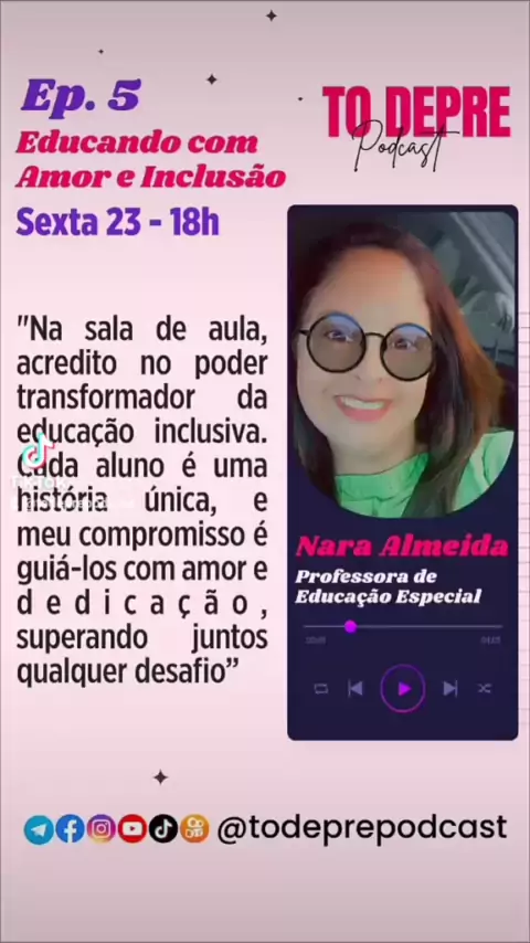 "Educando com Amor e Inclusão" 🎙️ No próximo episódio do To Depre Podcast, mergulharemos no inspirador universo da educação inclusiva com uma convidada extraordinária: Nara Almeida. Uma mulher incrível dedicada a transformar vidas através do ensino para alunos autistas e deficientes intelectuais. #autismo #deficienciaIntelectual #amor #professora #doação