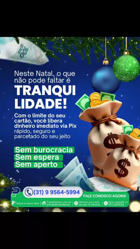 A Bem Soluções Financeiras transforma o limite do seu cartão em dinheiro imediato via Pix, com rapidez, segurança e condições que cabem no seu bolso. Ideal para quem quer organizar as contas, ofertas de fim de ano ou garantir um Natal mais leve. 💚 Por que escolher a Bem Soluções Financeiras? ✔️ Sem burocracia ✔️ Sem espera ✔️ Sem aperto ✔️ Dinheiro na conta em até 15 minutos ✔️ Sem consulta ao SPC/Serasa ✔️ Trabalhamos com as principais bandeiras ✔️ As menores taxas do mercado 31 995645994