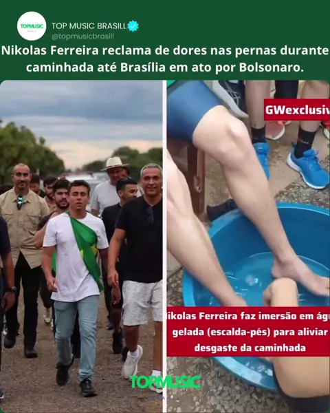 Nikolas Ferreira faz imersão em água gelada (escalda-pés) para aliviar desgaste da caminhada Durante a parada em Cristalina, o deputado federal Nikolas Ferreira realizou uma imersão em água gelada (escalda-pés) como forma de aliviar o desgaste físico provocado pela caminhada que realiza rumo a Brasília. A mobilização ocorre de forma pacífica e segue sendo acompanhada pela imprensa. Reprodução: GwNoticias