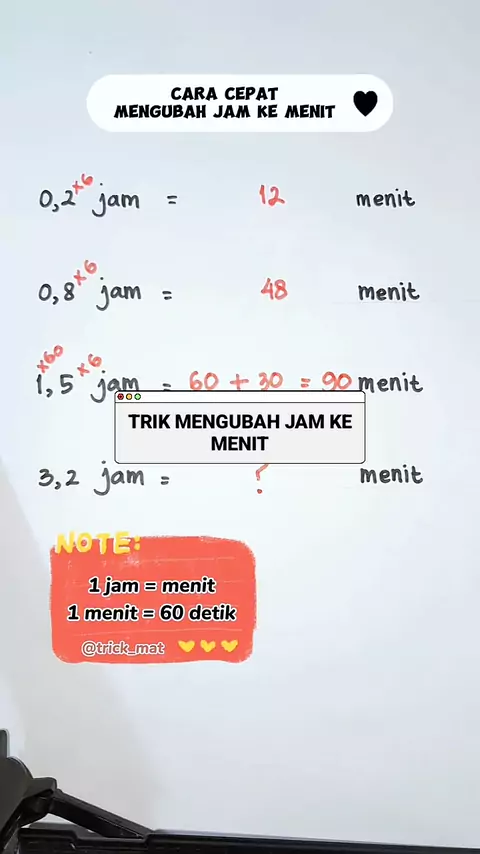 🕒 Mengubah Jam ke Menit Itu Gampang! Tinggal ingat satu kunci: 1 jam = 60 menit. Jadi kalau 2 jam? Tinggal 2 × 60 = 120 menit. Latihan dikit, lama-lama auto jago matematika 😄✏️ #matematika #belajarmatema #jamkemenit #tipsmatematika #anakpintar
