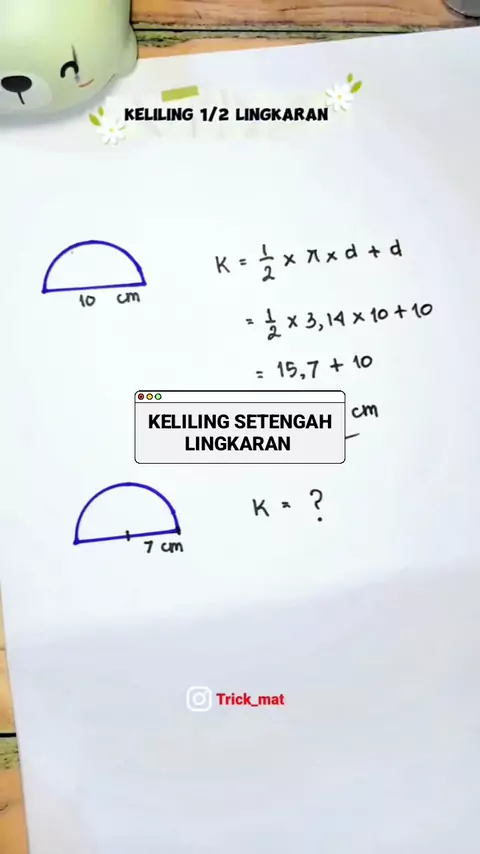 Keliling setengah lingkaran itu bukan cuma lengkungnya 😉 Rumusnya: ½ × 2πr + diameter Artinya, πr + 2r. Gampang kan kalau sudah paham konsepnya? Yuk belajar pelan-pelan, pasti bisa! ✨ #matematika #kelilinglingkaran #setengahlingkaran #belajarmatematika #rumusmath
