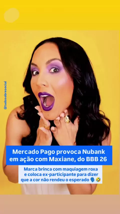 👀 Dizem que o roxo não combina com todo mundo... e a #Maxiane sentiu isso na pele (literalmente! 😂) O Mercado Pago, patrocinador oficial do #BBB26, aproveitou a treta recente da maquiagem, envolvendo a participante Ana Paula, que disse que a cor não ficava boa na eliminada, pra provocar a concorrente #Nubank. No vídeo, Maxiane diz que “escolheu o roxo, mesmo sabendo que poderia não render”. É treta no #bbb e no #marketing 🔥