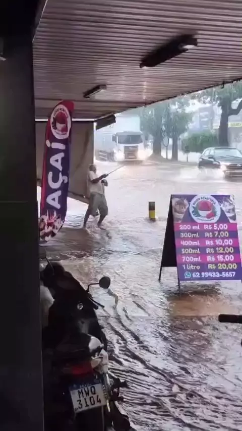 🎣🌧️ Homem improvisa “pesca” em meio a alagamento e vídeo viraliza em Aparecida de Goiânia Durante as fortes chuvas que atingiram Aparecida de Goiânia neste sábado (06), uma cena inusitada chamou a atenção e rapidamente viralizou nas redes sociais. Um vídeo mostra um homem em plena rua completamente alagada, improvisando uma espécie de “pesca esportiva” no meio da enxurrada. Nas imagens, o homem aparece segurando uma vara, como se estivesse pescando normalmente, mesmo diante do cenário de ala