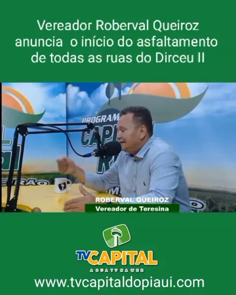 Em entrevista para o Capital Rural, o Vereador de Teresina Roberval Queiroz, anunciou o início das obras de asfaltamento do Bairro Dirceu II na zona sudeste da capital. @vereadorcaprobervalqueiroz @moreiraelshaday #tvcapitaldopiauí #dirceuii #prefeituradeteresina #teresinapiaui #teresina