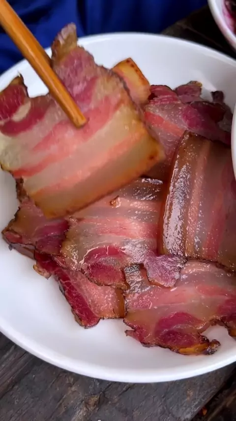 Bacon terbuat dari cabang putih dan populer dari kayu bakar, jadi itu adalah warna. # xiaojiu bacon sosis lezat # bacon # masakan pedesaan