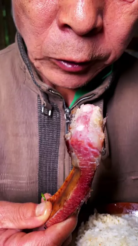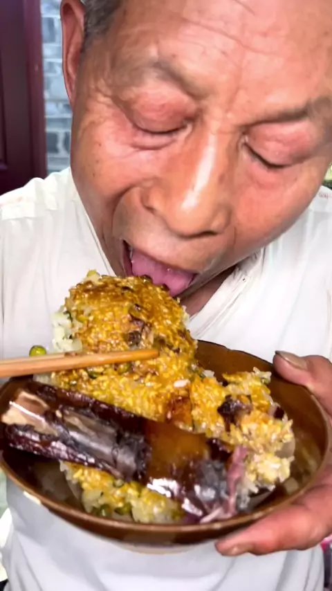 Makan sepotong daging yang diawetkan sebelum makan. # WeChat Ribs
