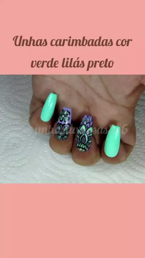 Unhas carimbadas cor verde lilás preto, #Unhas #nail #kwaimoda