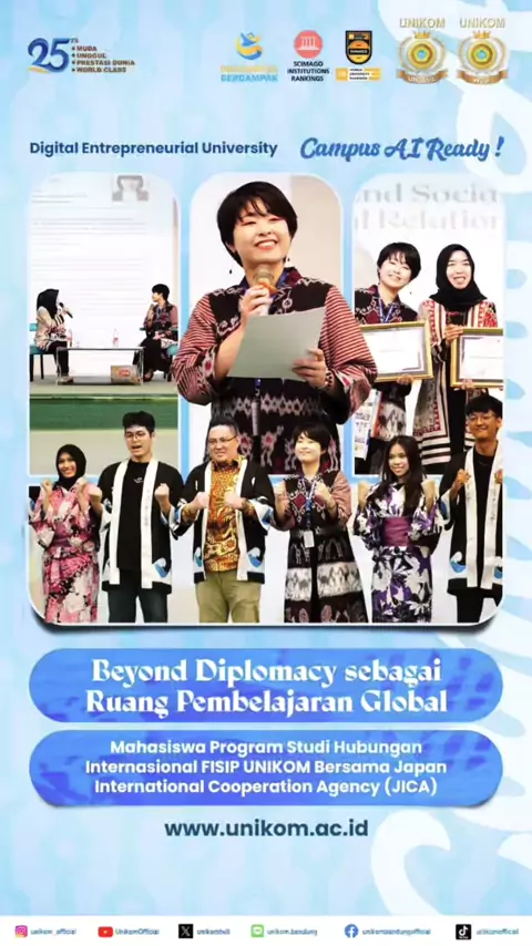 Mengangkat isu transformasi diplomasi modern, Prodi HI FISIP UNIKOM sukses menyelenggarakan Panel Lecture internasional 'Beyond Diplomacy' di Auditorium Miracle UNIKOM. Melalui dialog interaktif bersama ahli mancanegara, kegiatan ini menciptakan ruang belajar global yang mendalam bagi para peserta. Salah satu sorotan utama dalam kegiatan ini adalah paparan dari Erika Matano, Junior Expert dari Japan International Cooperation Agency (JICA). More info: www.unikom.ac.id