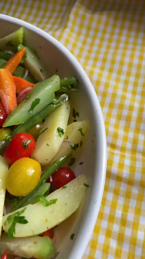 Salada de legumes ! Você gosta desse tipo de conteudo siga o perfil para mais receitas 🍝 Batata cozida no vapor Vagem cozida no vapor Cenoura cozida no vapor Chuchu cozido no vapor Cebola roxa Tomatinho vermelho e amarelo Azeitona preta Salsinha picadinha Pimenta biquinho Temperos, sal, pimenta calabresa, azeite e limão Créditos: @paulapiretti 💙 #lanche #receitas #receitasfit #comida #viral