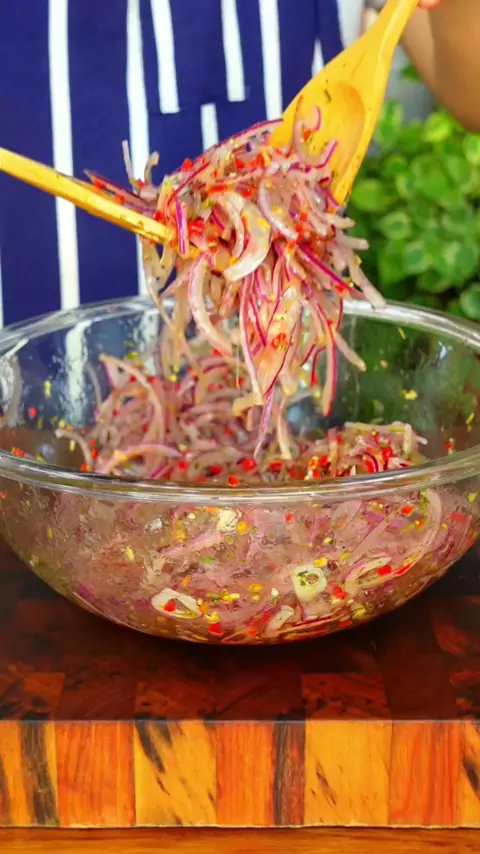 Salada de cebola de churrascaria!!😱😱 Esse é o tipo de receita perfeita pra se ter na geladeira, ainda mais nesses dias mais quentes. Essa salada de cebola melhora o almoço do dia a dia, vai bem com carnes grelhadas, com saladas, legumes... Enfim, faz que não tem erro!! Ingredientes: 3 cebolas roxas 1/3 xic de azeite 1/4 xic de vinagre (usei o de álcool, mas pode ser qualquer um, até mesmo o balsâmico) 2 pimentas dedo-de-moça picadinhas (sem semente) 2 colheres de sopa de chimichurri desidrat