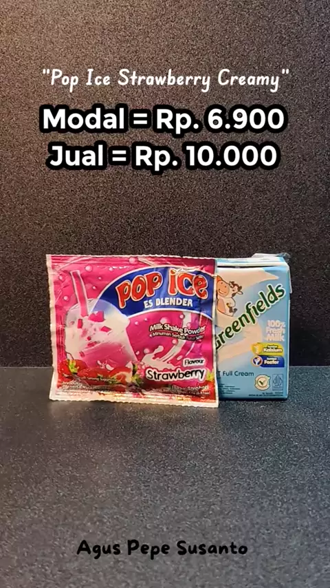"POP ICE STRAWBERRY CREAMY" Bahan : - Cup 14 Oz + sedotan + lid seal ( Rp. 800 ) - Pop ice Strawberry 1 sc + Air panas 70 ml ( Rp. 1500 ) - Freshmilk 100 ml ( Rp. 3500 ) - Susu Evaporasi 30 ml ( Rp. 900 ) - Es Batu ( Rp. 200 ) Estimasi HPP : - Total Modal = Rp. 6.900 - Harga Jual = Rp. 10.000 - Profit = Rp. 3.100 Harga jual bisa disesuaikan dengan daerah masing-masing.#ideusahaminuman#reelsviral#estehhijau#minumankekinian#usahaminuman
