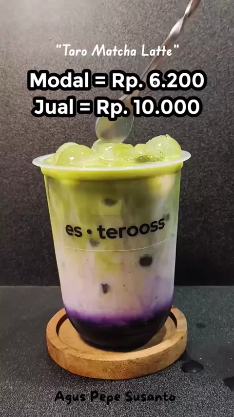 "TARO MATCHA LATTE" Bahan = - Cup 14 Oz + sedotan + lid seal ( Rp. 800 ) - Sirup GKC Taro 20 ml ( Rp. 1600 ) - Air 50 ml ( Rp. 100 ) - Fresh Milk 100 ml ( Rp. 2000 ) - Matcha Maxfood 3 g ( Rp. 1500 ) - Es Batu ( Rp. 200 ) Estimasi HPP - Total Modal = Rp. 6.200 - Harga Jual = Rp. 10.000 - Profit = Rp. 3.800 Harga jual bisa disesuaikan dengan daerah masing-masing.#ideusahaminuman#reelsviral#redvelvet#matcha#estehhijau