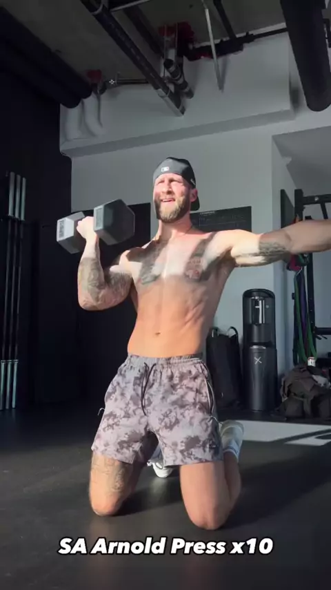 Um haltere treino parte superior do corpo 4 rodadas 10 repetições de cada 60 segundos de descanso SA Arnold Press x10 Lado) Curl to Chest Press x10 Dobrar sobre Row x10 Sentar-se com peso x10 # arms # armsworkout # armworkouts # shoulderworkout # bíceps # upperbodyworkout # gym # workout # exercise