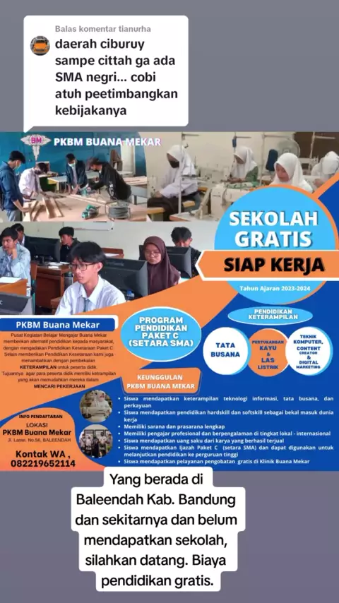 Membalas @tianurha sebagai alternatif, bisa ambil paket C di PKBM. Bagi anak usia sekolah yang belum mendapatkan bangku sekolah, dan tinggal di sekitar Baleendah Kab. Bandung silahkan datang ke PKBM Buana Mekar, biaya pendidikan gratis.#pendidikan#pkbm#pkbmbuanamekar#ppdb#sma#smk#paketc#baleendah#ciparay#banjaran#bandung