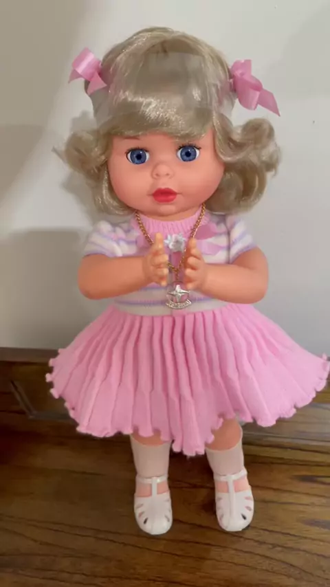 Esta boneca é uma verdadeira relíquia que desperta a nostalgia de quem cresceu entre os anos 80 e 90! Trata-se da icônica boneca Amiguinha, da Estrela, em uma de suas versões clássicas que "bate palminhas". #Anos80 #Anos90 #BonecaAmiguinha #Estrela #RelíquiasDeInfância