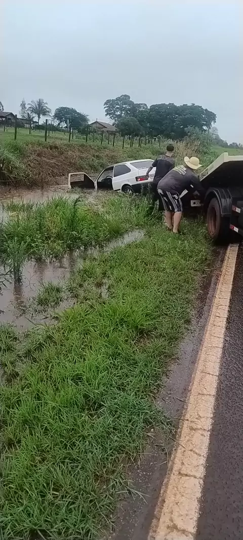 Ivinhema - Motorista perdeu controle da direção e caiu em um buraco na lateral da rodovia MS - 141 devido muita água acumulada na pista