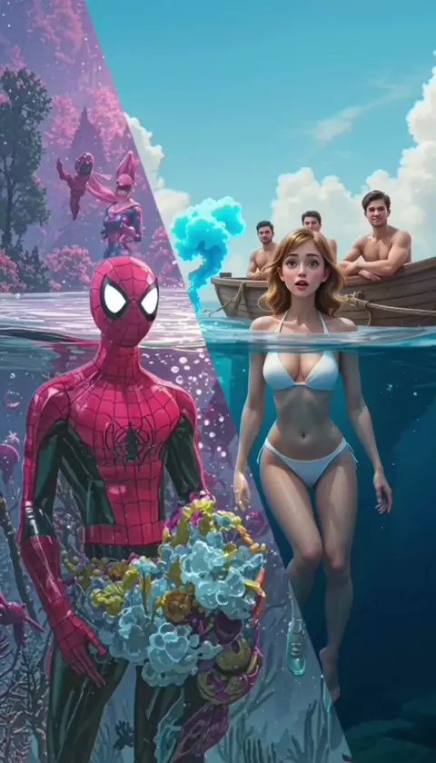 PARTE-1: Como o Homem-Aranha Encontrou Sereias no Mar Uma cena cômica e surreal onde o Homem-Aranha encontra uma sereia no mar, enquanto um grupo observa de um barco, capturando um momento inesperado e divertido#SpiderManAdventures #MermaidEncounter #OceanFun #ComicTwist #UnexpectedMoments