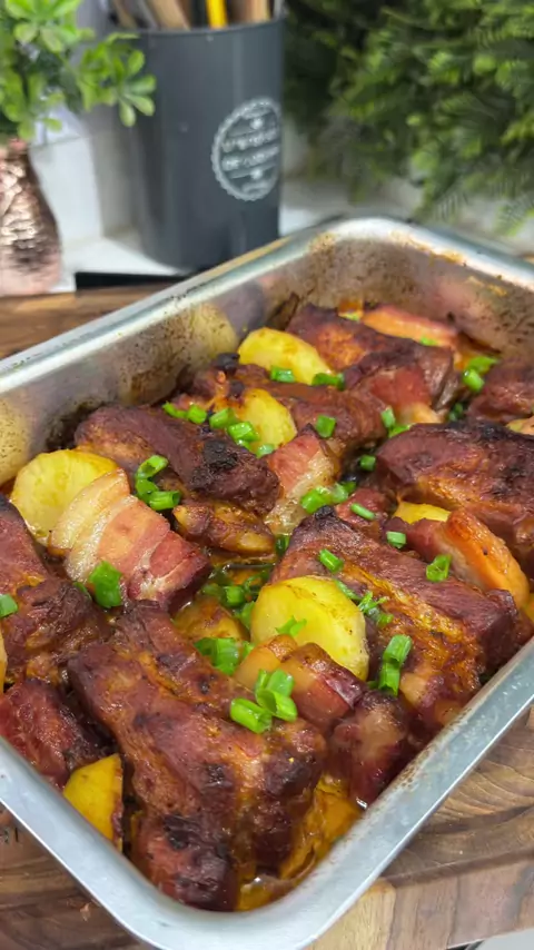 Costela suína com batata e bacon 🥓 1 kg de costela de porco 200g de batata 200g de bacon 3 dentes de alho 1 colher de mel 2 colheres de azeite 1 limão 2 colheres de mostarda Temperos: paprica, pimenta, cominho, pega marido, corante e sal