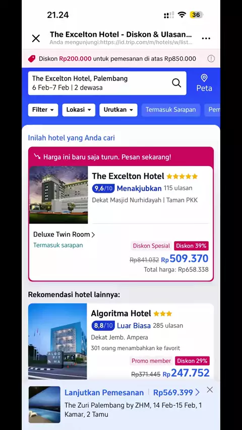 dan tambahan diskon 200ribu utk pesanan di atas 850ribu.. Yuk, klik lokasi yang ditandai untuk dapatkan diskon up to 50% dan ajak pasangan kalian liburan romantis di tanggal 4-17 Februari#LiburanPenuhKasih#theexceltonpalembang#promohotelpalembang#promohotel#ValentineSpecialHotel