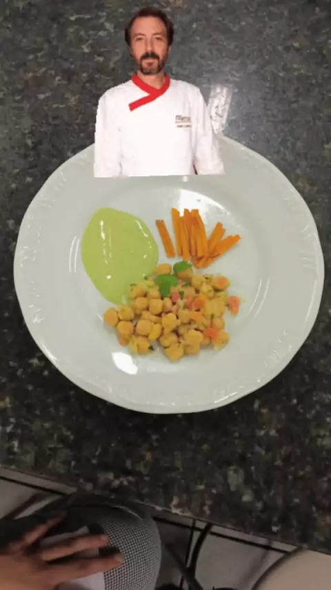 Salada de grão de bico, creme de espinafre e palitinhos de abóbora 😋😋😋😋