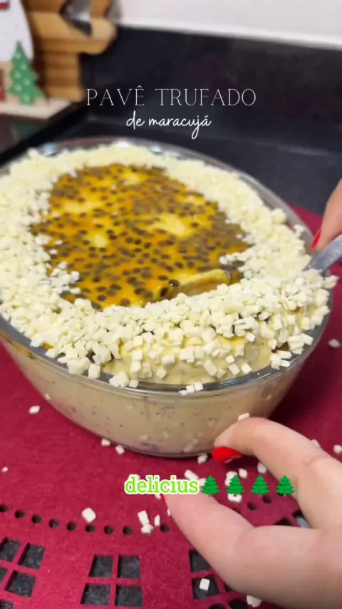 🎄 INGREDIENTES: - 1 lata de leite condensado - 1 caixinha de creme de leite - 3 maracujás (ou 1 xícara de suco concentrado) - 1 colher de leite em pó - 1 barra de chocolate branco - 50g de confeito de chocolate branco (opcional) - 1/2 pacote de bolacha champanhe (75g) Geleia: - 1 maracujá - 1 colher de açúcar 🎄 PREPARO: Bata os ingredientes no liquidificador. Em uma travessa, coloque uma camada de mousse, uma de bolacha, mousse, bolacha e finalize com a mousse. Cubra e leve para geladeira.
