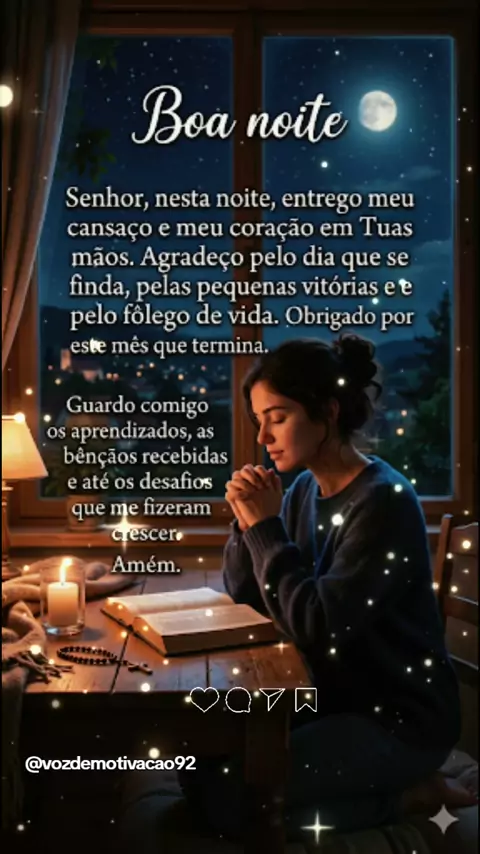 ​"Que a sua noite seja de entrega e renovação. Deixe as preocupações de lado e confie que o amanhã será guiado por algo maior. Durma em paz! 🌙✨" ​#BoaNoite ​#Confiança ​#Fé ​#Descanso ​#PazInterior