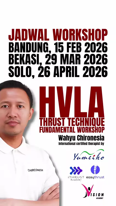 Jadwal Workshop HVLA Thrust Technique Bekasi 29 Maret 2026 Solo 26 April 2026 Pendaftaran workshop HVLA Thrust Technique & Reservasi Terapi Hubungi WA Admin 085221379352 / 081546430973 #bonesetting #hvla #chiropractic #kretek