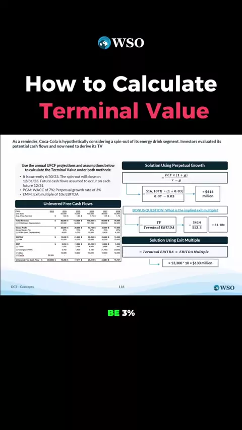 ๐Ÿค” The terminal value is the predicted value of companies or a project beyond the specific forecasting period in the DCF model. Calculating the present value of future cash flows is usually completed through the process of discounted cash flow analysis. ๐Ÿง‘โ€๐Ÿ’ป This value can be calculated using the perpetual growth method and exit multiple methods. ๐Ÿ’ก Here's an example of how to calculate terminal value. Want to make sure you have all the technicals down? ๐ŸŽฏ Apply to WSO Academy now and get 1:1 ...