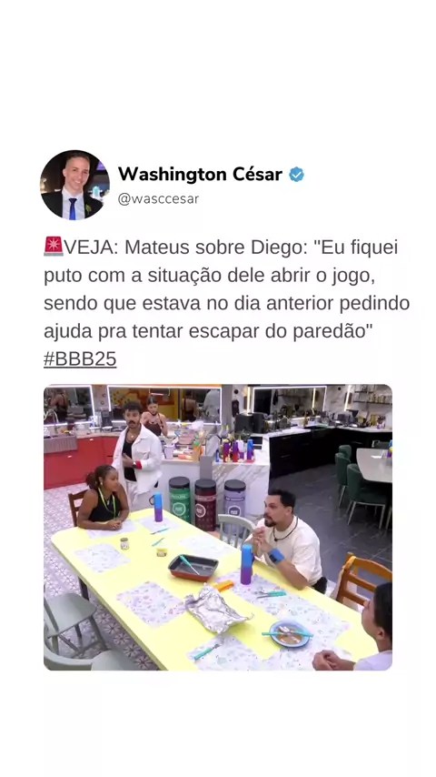 🚨VEJA: Mateus sobre Diego: "Eu fiquei puto com a situação dele abrir o jogo, sendo que estava no dia anterior pedindo ajuda pra tentar escapar do paredão"#BBB25