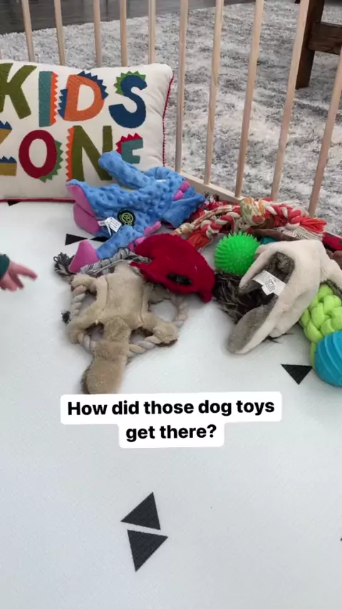 Just trying to make the playpen more fun 🤪 🤍#babyandme#babyanddog#babyanddoglove#dogbaby#dogbabylove#BestFriends#dogtoys#playpen#sahm#grwm#antihero