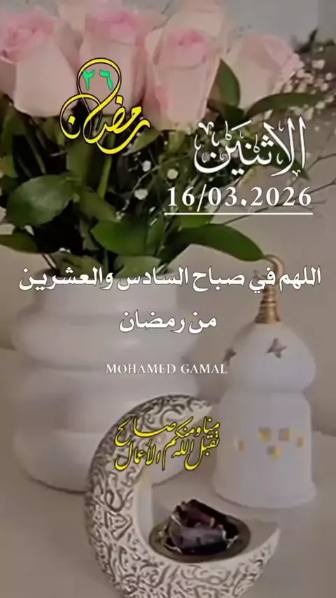 دعاء صباح يوم السادس والعشرين من رمضان 🤲🌹🌹 اللهم في هذا الصباح اكتب لنا مغفرة تمحو تقصيرنا وفرحًا يبدل أحزاننا وطمأنينة تملأ قلوبنا وبلغنا ليلة القدر ونحن في أجمل حال وفي صباح يوم الاثنين 2026/3/16 - اللهم : • افتح لنا أبواب الرزق والسعادة • وأن تيسر لنا كل أمر عسير • وأن تنير دروبنا بنور هدايتك - اللهم اجعل يومنا هذا : - بداية جديدة مليئة بالأمل والطموح - وارزقنا القوة والعزيمة لتحقيق أحلامنا وطموحاتنا صباحكم مُفعم بالسعادة والأمل